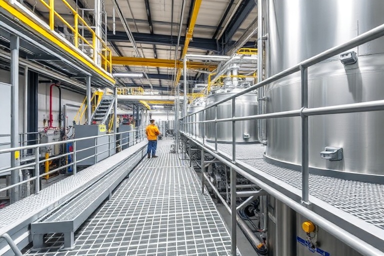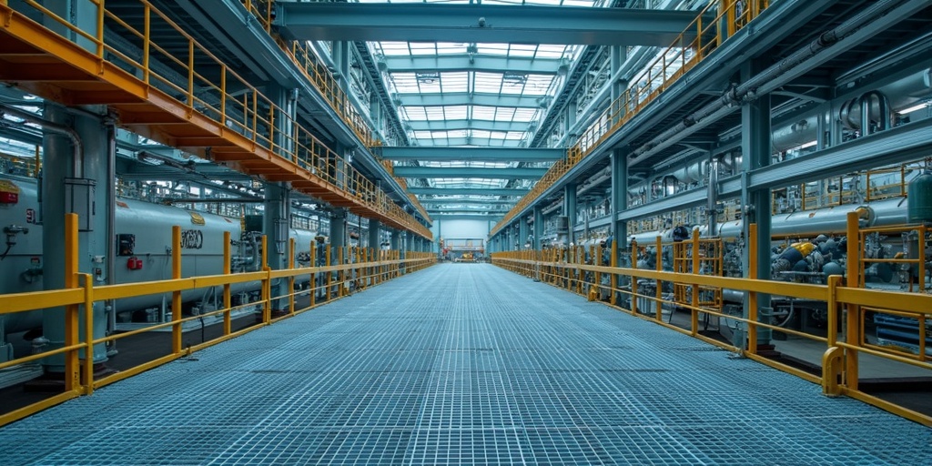 High-strength FRP gratings ensuring worker safety and durability in corrosive industrial environments.