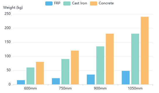 At just 1/4 the weight of cast iron and 1/2 the weight of aluminum, our FRP products are easier to transport, install, and maintain without sacrificing strength.